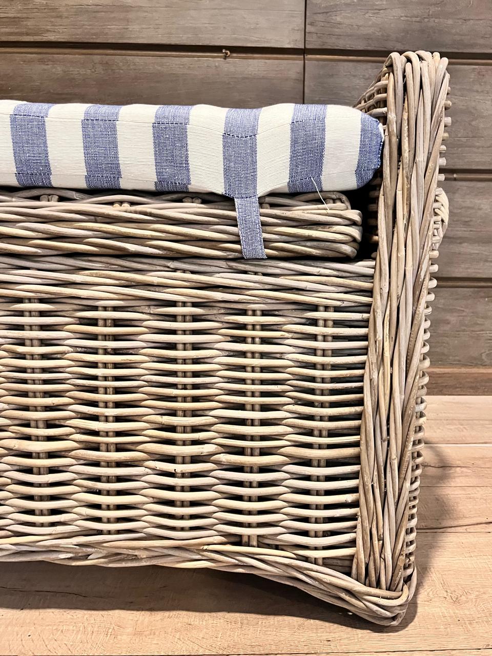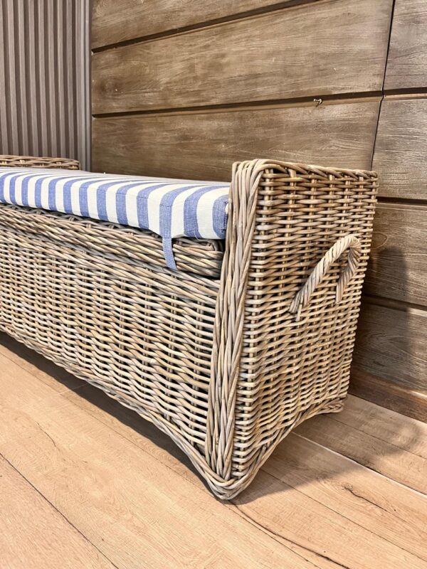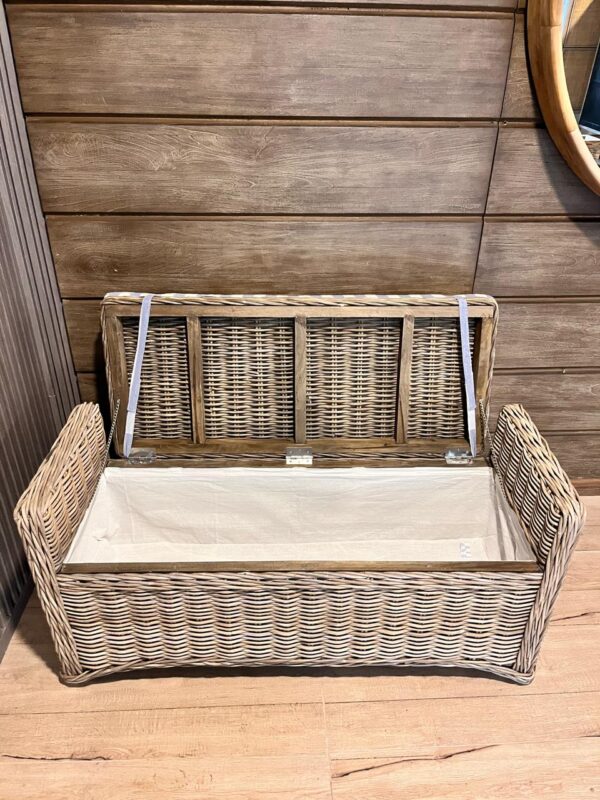 Decorativa y funcional banqueta, fabricada en rattan natural con terminacion de pintura en color gris vintage. Ademas se abre como baul. Incluje cojin en asiento