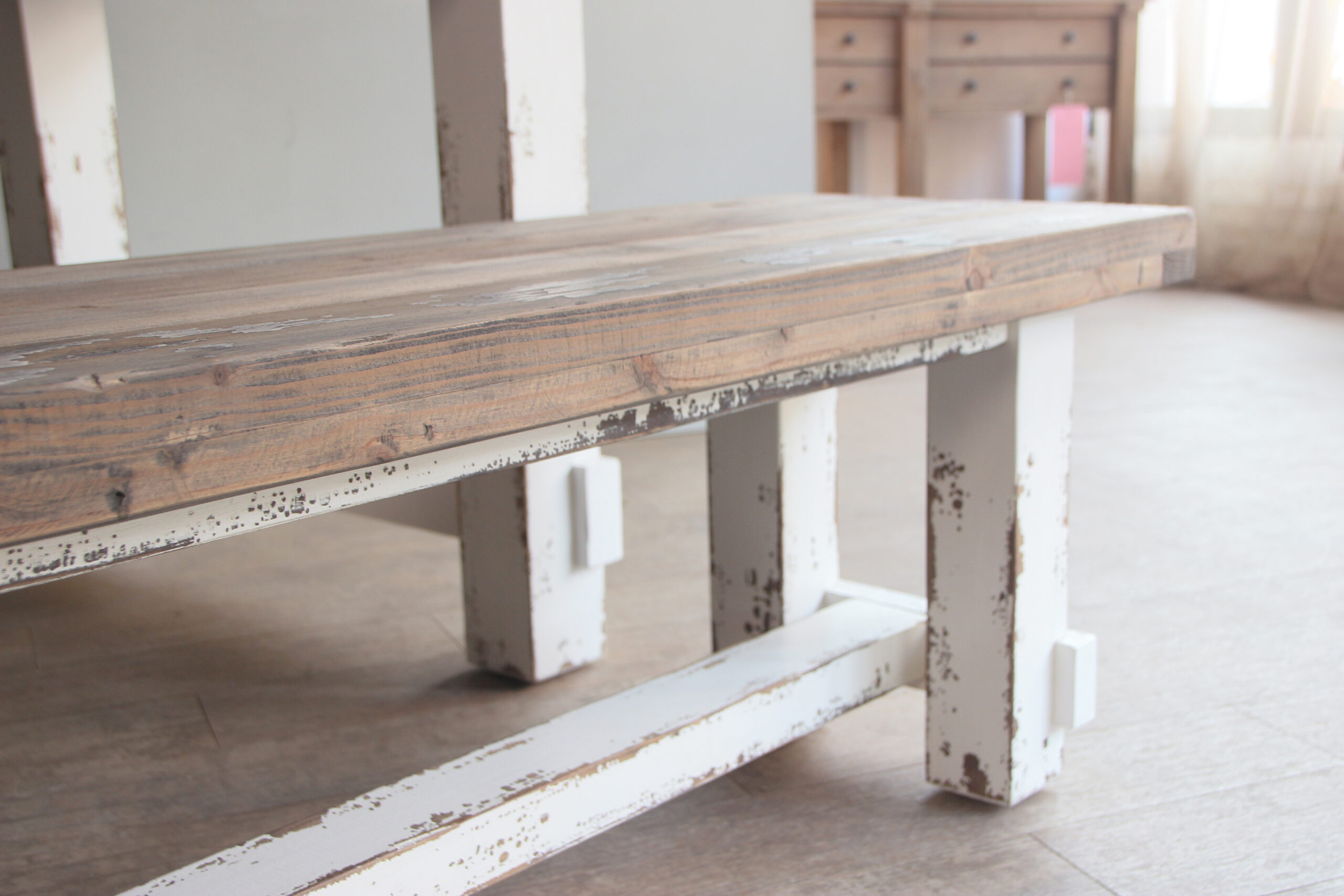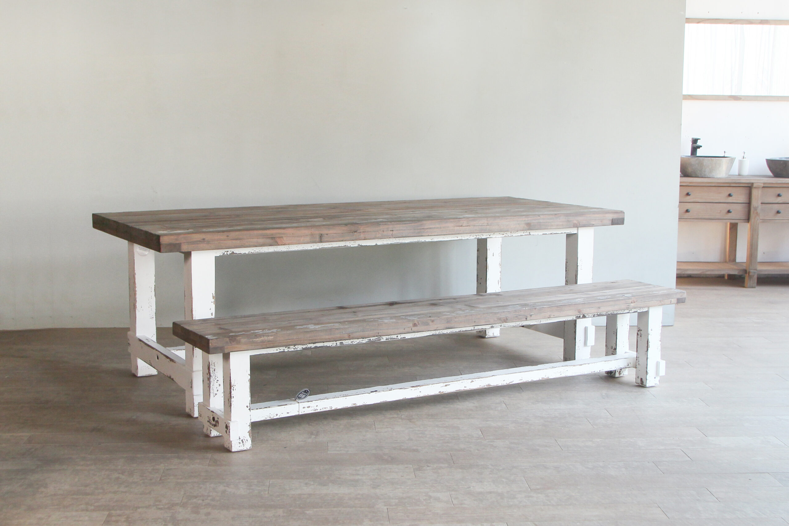 Simple y práctica banqueta fabricada en estructura de madera de pino reciclado con tratamiento de pintura white wash en patas y cubierta rústica. Ideal para se usada en comedores interior y terrazas techada.