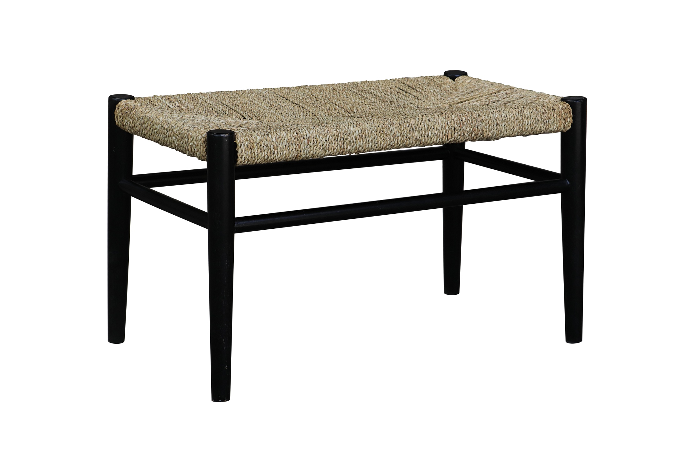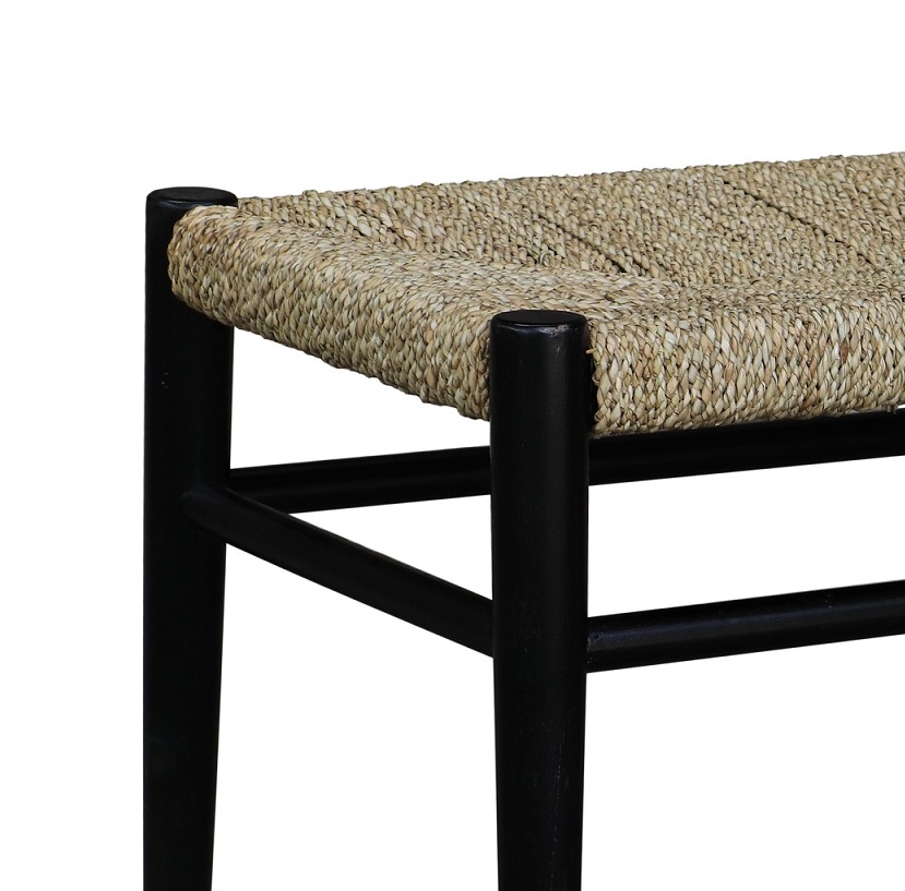 Simple y practica banqueta fabricada en madera con tratamiento de pintura negro mate y tejida con fibra marina