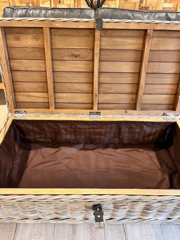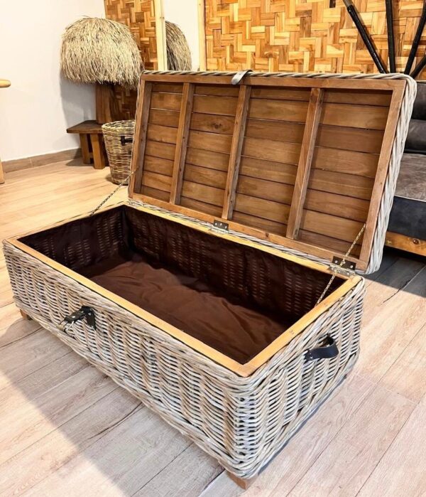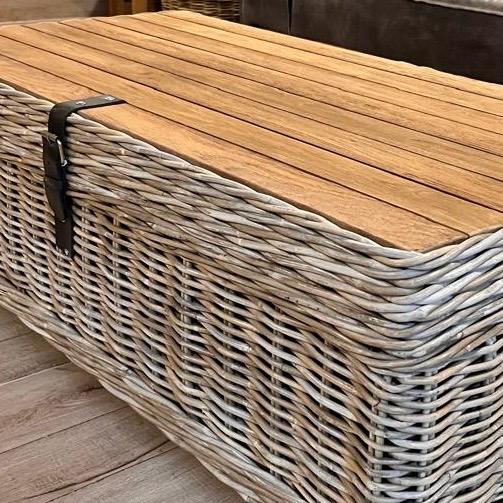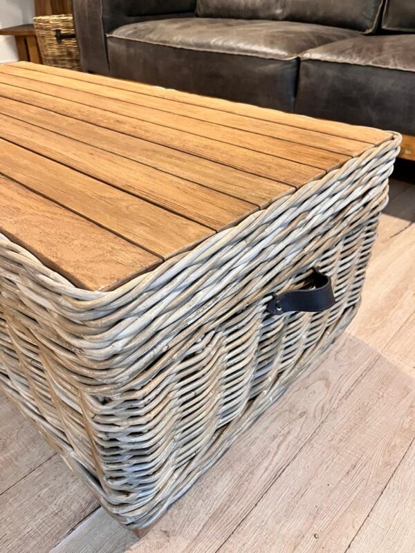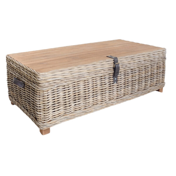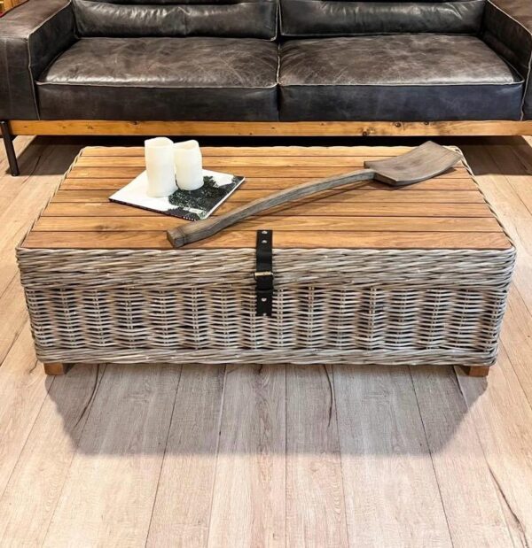 Decorativa y funcional mesa de centro tipo baul, fabricada en rattan natural con terminacion de pintura en color gris vintage, con cubierta de madera de teca. Cuenta ademas con tiradores fabricados en cuero.
